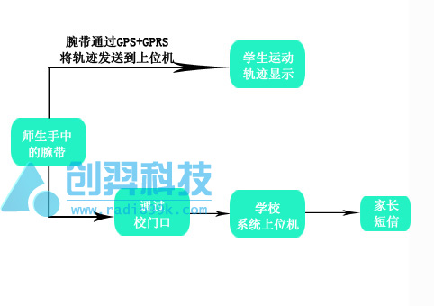 使用GPS+GPRS功能的系统不仅能在学校里面定位学生的具体位置,在上学放学途中也能定位标签的运动轨迹,从而定位学生,在上学放学途中都能让家长老师知道学生的动向,是否到达学校,路上是否发生任何状况。学生佩戴腕带标签,标签上有GPS+GPRS功能,能将学生的运动轨迹时时通过GPRS功能发送到系统中心。学校班主任老师和领导只要登录系统软件端就能查看学生的运动轨迹,随时知道学生的具体地理位置。当学生学校校门口时,同样校门口的读卡器能读取标签信息,系统发送信息给学生家长;各个场所的读卡器都能将学生的具体位置发送给系统软件端,当有必要时,老师家长能随时调用查看。如果到上学时间学生还没来上课,系统发出报警,老师或者管理员去查看学生目前所在的区域位置,看是否在上学路上,或者发生什么事情。确认发生紧急状况可报警。
