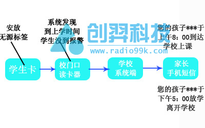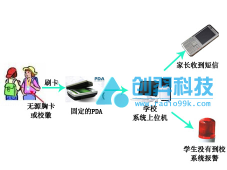 无源系统的特点是接触式刷卡,成本相对低。师生的无源标签安放在学生的校徽或者学生佩戴在胸前的卡上面,每个无源标签都有不同的ID号,每个ID号对应的师生都能在读卡器上读到相应的信息。读卡器安在校门的两边,和系统软件端相连。师生上下学分别刷卡,读卡器读到某学生刷卡信息后,系统软件中心发送信息给相应学生家长,如“您的孩子***于上午8:00到达学校上课。”,“您的孩子***于下午5:00离开学校放学。”。使用这种方法可以让家长知道孩子今天到没到学校,没到可以和学校那边沟通;学校也能从系统软件端知道哪些孩子今天来了,几点来的,几点走的,没来的话可以和家长沟通。