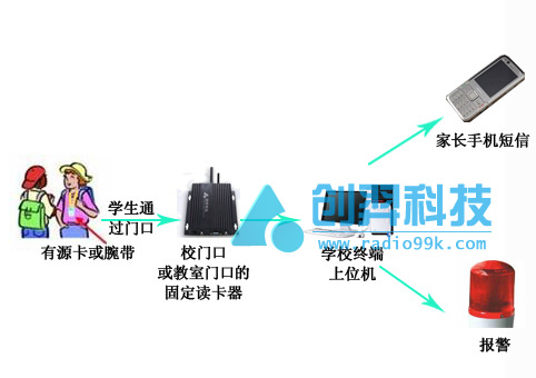 有源系统,顾名思义是采用有源电子标签,在某个固定区域内定位学生。有源标签可以安放在学生校徽或者学生卡上,也可以佩戴像电子手表一样的腕带在校门口和各个教室门口安防读卡器。当学生进出校门,靠近校门口的读卡器时,校门口的读卡器会自动读到标签的信息,发送数据到系统中心,系统中心就调用软件系统,发送信息给相应的学生家长,原理和无源的类似;当学生进出班级时,教室门口的读卡器会读取标签的信息,发送给系统中的上位机。上位机记录该学生进出教室的信息,让学校老师或领导在必要时能随时查询到。班级的老师发现上课时缺少某个同学亦可根据记录查询该同学的离开信息。有源与无源相比优点是,有源不止进出校门的过程有记录,进出教室或者其他区域空间也能实现定位。例如:在教室上课,教室中少了一个人,系统就会报警,提醒老师,查找这名学生的区域位置。