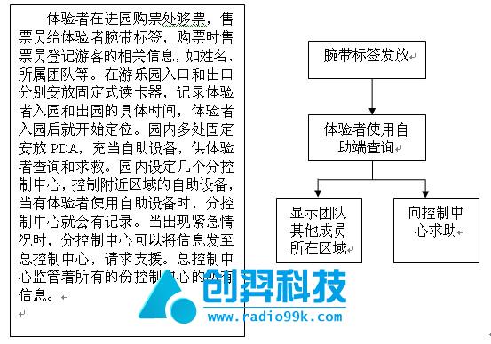 体验者在进入园区购票时,每人分发并佩戴一个有源电子腕带标签,标签上记录了体验者的相关信息,如果是两人或者两人以上就组成团队,团队使用同样的ID后缀号码,如:1233423A和1234553A是同一团队,1244545B和2334545B和1234456B是属于同一团队,这样团队中某一成员丢失时方便区域定位。游乐园广泛固定PDA式读写器终端充当自助设备,供体验者查询和求救。若团队中的成员使用自助设备,自助设备会自动搜索团队其他成员的区域位置,在屏幕上显示。在园内设定多个分控制中心,若收到附近体验者的发出的求救信息,分控制中心的救援人员能第一时间赶到现场,并且通知团队的其他成员。当体验者离开游乐园时,交回腕带标签,工作人员将标签中的数据清空,以备下次使用。