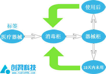 标签在进入器械柜中开始设置计时,科室护士在提取器械包时,结束计时,清除计时数据。系统设置时间14天,如果14天后器械包没有被科室护士提取,那么器械柜上的固定读卡器报警,提醒消毒护士消毒,同时也提醒科室护士这个器械包不能提取。